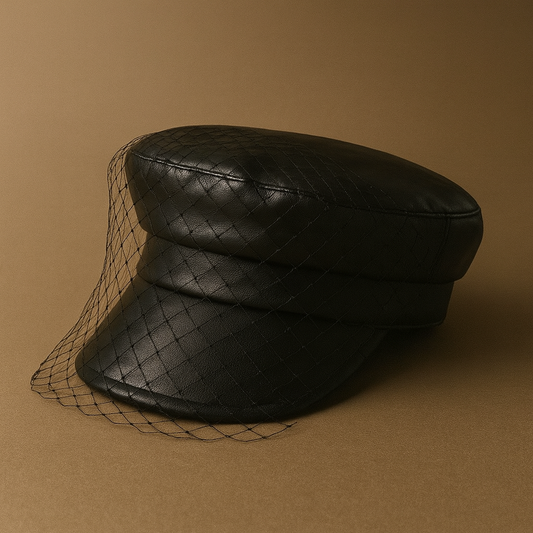 Chic, bold, and effortlessly elegant — this black leather hat with a delicate net veil...